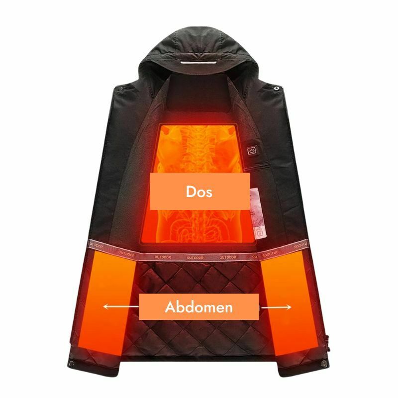Mit einem Heizsystem, das sich über Rücken und Bauch erstreckt, sorgt die Heizparka für eine gleichmäßige und angenehme Wärme.